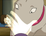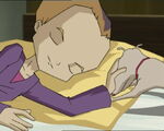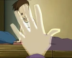 When Odd (Yumi) asks what's going on, Ulrich tells her to ask "that imbecile, Odd". When they reach the cafeteria, Yumi (Odd) asks, "Well, did you find it? I've had it since I was really little." That night, Mr. Ishiyama asks his daughter why she isn't eating. A piece of sushi slips out of Yumi's (Odd) chopsticks, much to Odd's embarrassment. Then, he has a flashback in which Yumi hands him the green device, telling him it's only for an emergency. Odd puts down his chopsticks and pulls out the green device. He pulls off the top, revealing the device a large fork for small children. He jams it into a piece of sushi and puts it into his mouth. As he looks around him, seeing Yumi's family staring in disbelief at him, he tells them that he's going to bed and leaves the dinner table. Hiroki declares his big sister's actions as an effect of love. In the bathroom, Odd sees his hands flicker and momentarily become partially transparent, something that obviously shouldn't be happening.