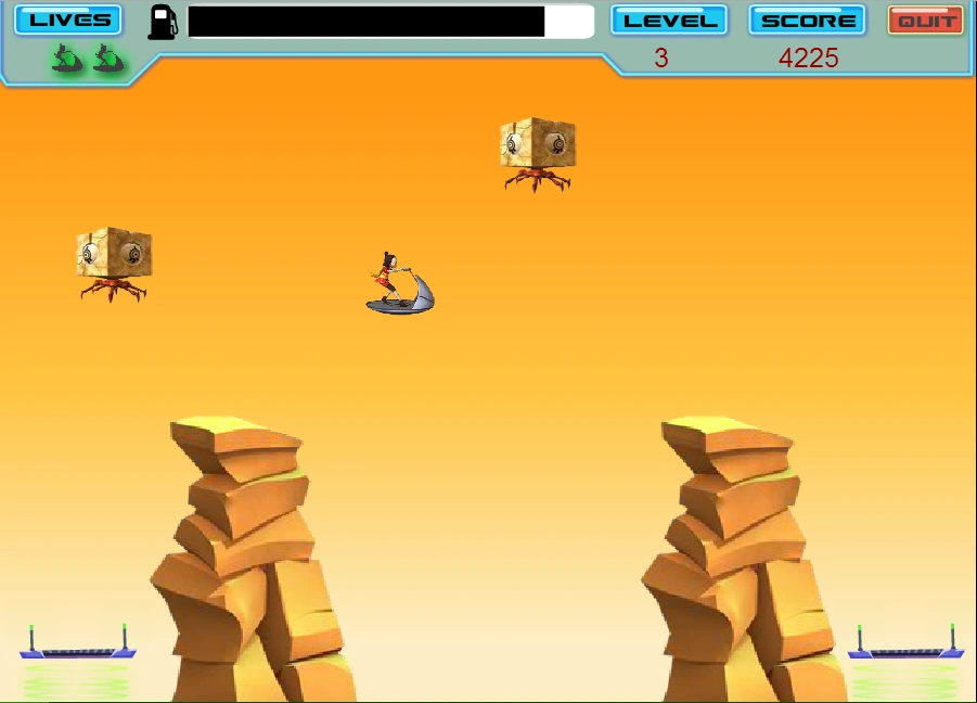 The player controls Yumi on the Overwing. She starts on one platform which is inexplicably hovering in the Desert, and must make it to the other platform without hitting anything. If she goes out of bounds, hits the other platform too hard, or hits anything else; she blows up, the level resets, and she looses a life. The game finishes when she runs out of her 3 initial lives, or she finishes all 8 levels, whichever happens first. Fuel is consumed by motion, with a per-level score calculated based on a mixture of fuel consumption and quality of landing.