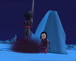 Yumi virtualizes herself onto the Ice Sector, where she is confronted by two Krabs. While Yumi battles the monsters in front of the activated tower, Odd sends Kiwi out on a dinghy into the lake, and convinces Jim to use a second dinghy to paddle out and save him. While Jim is distracted, Ulrich and Aelita leave the island in the third dinghy. The spectre attacks, and both Jim and Ulrich are knocked unconscious, but Aelita manages to get to shore and takes Sissi's bicycle, which was left on the main land, to travel to the Factory. Meanwhile, on Lyoko, Yumi defeats the Krabs but one of their lasers knocks her inside the tower. Yumi waits there only to be ambushed by William, who was waiting inside. He kicks her from the tower and the two begin fighting. As the two duel, William has the upper hand and almost devirtualizes Yumi, but she pleads, telling him that he swore to fight alongside the group as a Lyoko Warrior. Her words cause William to remember when he joined the group and he begins to fight X.A.N.A.'s possession.